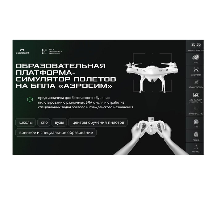 Образовательная платформа-симулятор для обучения навыкам управления беспилотниками "Аэросим" "Аэросим" предназначен для обучения пилотированию БПЛА с нуля, выполнения гражданских и боевых задач, а также повышения квалификации пилотов.